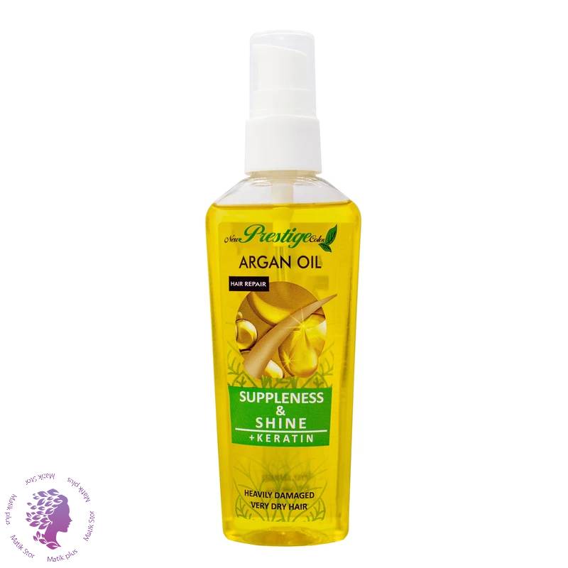 سرم موی روغن آرگان گیاهی نیو پرستیژ به عنوان یک درمان برای مو استفاده می‎شود. این محصول برای تقویت ریشه مو و رشد سریع مو بسیار موثر است و معمولا به عنوان یک نرم کننده استفاده می‎گردد. این سرم مو مزایای زیادی برای موها دارد. همچنین این محصول قادر است به عنوان یک مرطوب کننده برای پوست سر، مبارزه با شوره و پوست سر خشک عمل کند. سرم مو پرستیژ می‎تواند باعث رشد و قوی شدن موهای نازک شود و موهای شکننده را از میان ببرد.حتی می‎تواند برخی از آسیب‎های انجام شده از طریق درمان‎های شیمیایی، رنگ و یا دکلره را درمان کند. در ترکیبات این سرم از روغن آرگان، روغن بادام، روغن نارگیل، کراتین و ویتامین E استفاده شده است. روغن آرگان به عنوان یک مرطوب کننده و آبرسان قوی کاربرد داشته و ویتامین E و اسیدهای چرب آن باعث می‎شوند تا مو رطوبت و شادابی خود را حفظ نماید. روغن آرگان به خوبی موخوره و وز مو را از بین می‎برد و باعث می‎شود مو سالم، براق و درخشنده و حالت پذیر شود. وجید اسید هیالورونیک در روغن آرگان باعث آبرسانی و حفظ رطوبت مو شده و آن را صاف‎تر و نرم‎تر می‎کند. همچنین این روغن باعث کاهش التهاب پوست سر شده و خاصیت آنتی اکسیدانی آن باعث بهبود آسیب‎های وارد شده به پوست سر می‎گردد. استفاده مداوم از این روغن باعث تنظیم ترشح چربی پوست سر نیز می‎گردد. این روغن مقاومت مو را در برابر دستگاه‎های حرارتی مانند سشوار و اتو مو افزایش داده و به عنوان یک درمانگر موقت کاربرد نداشته بلکه یک همراه همیشگی برای حفظ ریبایی شماست. ویتامین E موجود در سوم موی پرستیژ باعث افزایش رشد مو شده و به عنوان یک آنتی اکسیدان قوی برای تقویت و رشد مجدد مو تاثیر شگرفی دارد. جهت استفاده از این محصول توصیه می‎شود بعد از حمام به موهای مرطوب یا خشک ماساژ داده تا به طور کامل جذب مو شود.